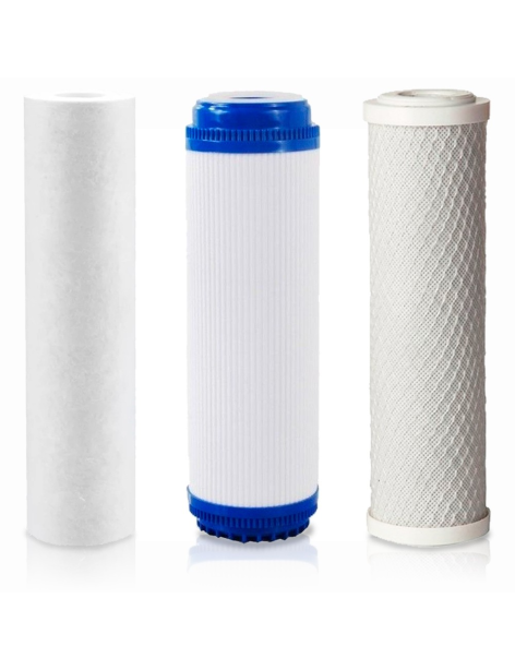 Incluye tres filtros esenciales para mantener el correcto funcionamiento del sistema de ósmosis inversa, asegurando agua limpia y baja en sales.
