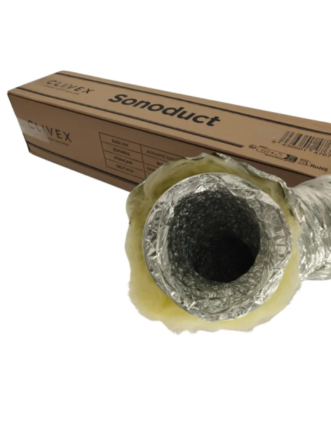 Conducto flexible con doble capa aislante que reduce significativamente el ruido generado por extractores. Mejora la eficiencia del sistema de ventilación manteniendo discreción y rendimiento óptimo.