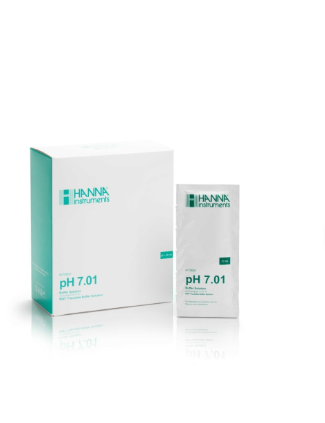 Sobres individuales de solución tampón pH 7 para calibración precisa de medidores de pH.