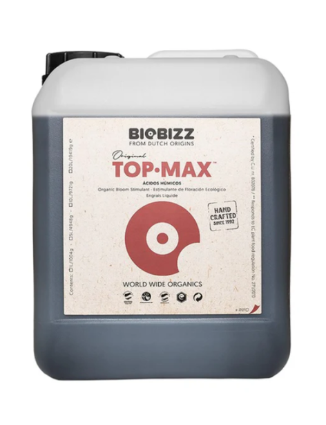 Top Max 5L de Biobizz favorece una floración explosiva gracias a su alto contenido en ácidos húmicos y fúlvicos. Mejora la absorción de nutrientes, incrementa la producción de azúcares y potencia el sabor natural de las flores. Indicado para cultivos en tierra, coco e hidroponía.