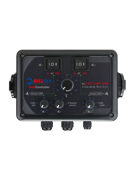 Twin Controller 12+12 permite controlar dos dispositivos de forma independiente, como extractores o ventiladores. Ideal para gestionar temperatura y ventilación de manera eficiente en espacios de cultivo.