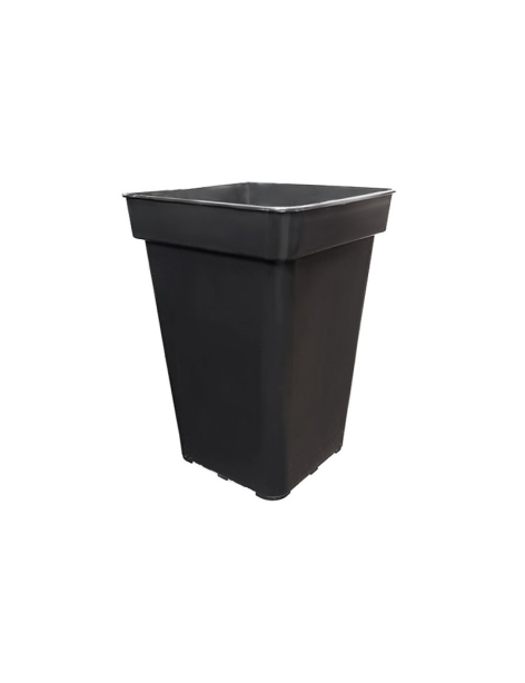 Contenedor plástico resistente que favorece un desarrollo radicular uniforme gracias a su formato cuadrado optimizado para espacios reducidos.