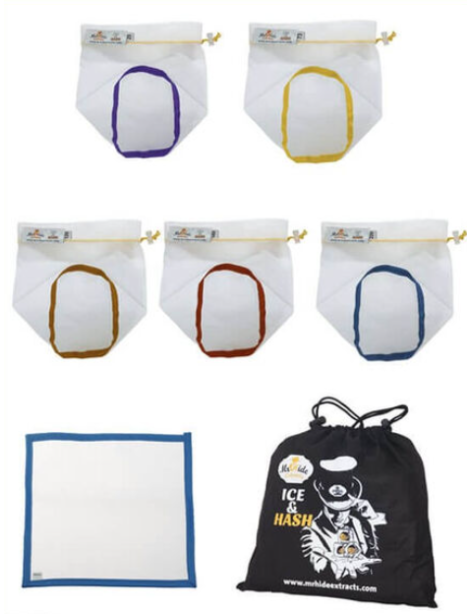 Conjunto de 5 bolsas filtrantes de diferentes micrajes, diseñadas para la extracción por agua y hielo, permitiendo separar resinas según tamaño de partícula.